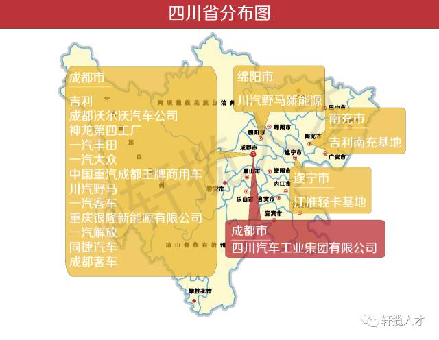 从这张分布图中能够看出,四川的车企出产制制核心次要集中正在成都这一块,成都的汽车财产次要集中正在龙泉驿何处,谈到成都的主要性,一汽公共汽车无限公司总司理安铁成已经说过:“成都是一汽公共继之后的第二个出产,它的建成对于一汽公共来说,”