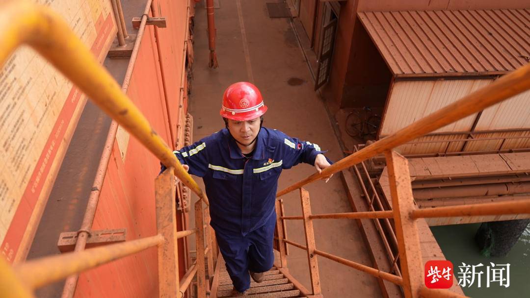 正在连云港港旗台功课区有一座江苏省独一的40万吨矿石船埠。从远处就能看到,四台高峻的红色卸船机像巨人一般立正在海边,快要海货轮运来的铁矿砂进行卸载,然后再运往各地。朱浩东现任连云港新苏港船埠无限公司矿石操做部司机三班班长,他率领的班组就担任着包罗这四台卸船机的平安高效运转。
